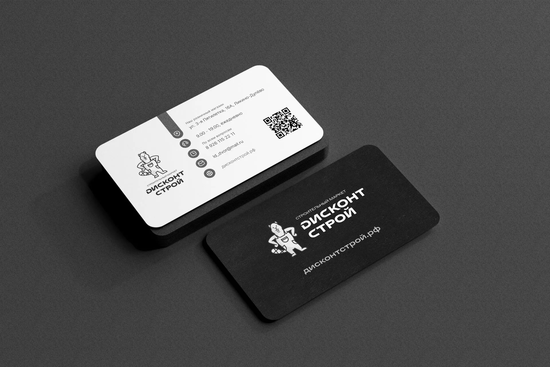 Вместе с логотипом, мы предложили заказчику сразу визуализацию логотипа в возможном дизайне на фирменный визитках магазина «Дисконт Строй» в Ломоносове.